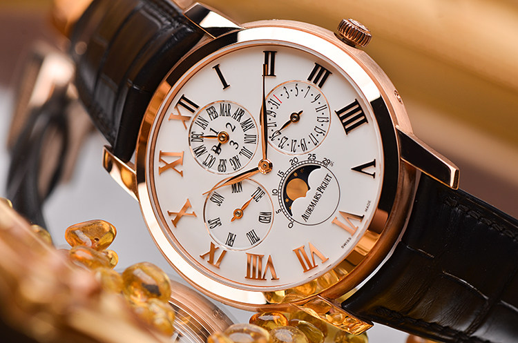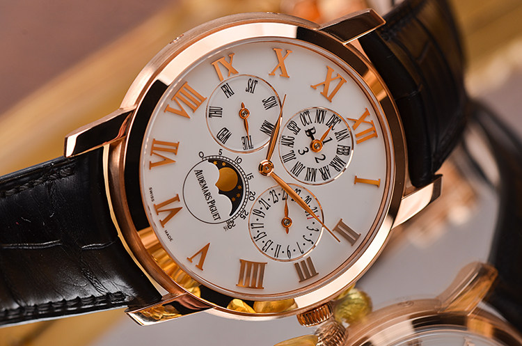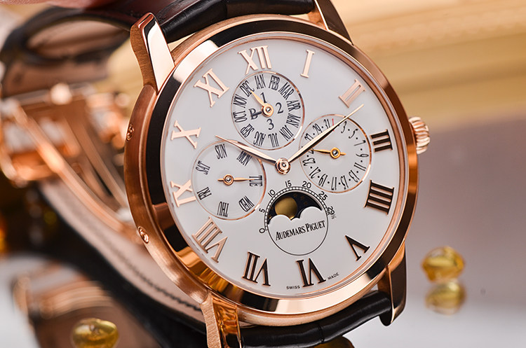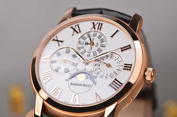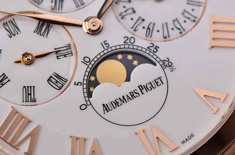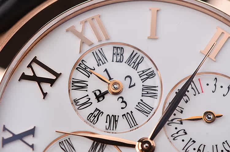 表盘:立体生漆白色万年历月相表盘(体现搪瓷效果),玫瑰金罗马数字刻度及指针
