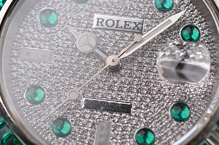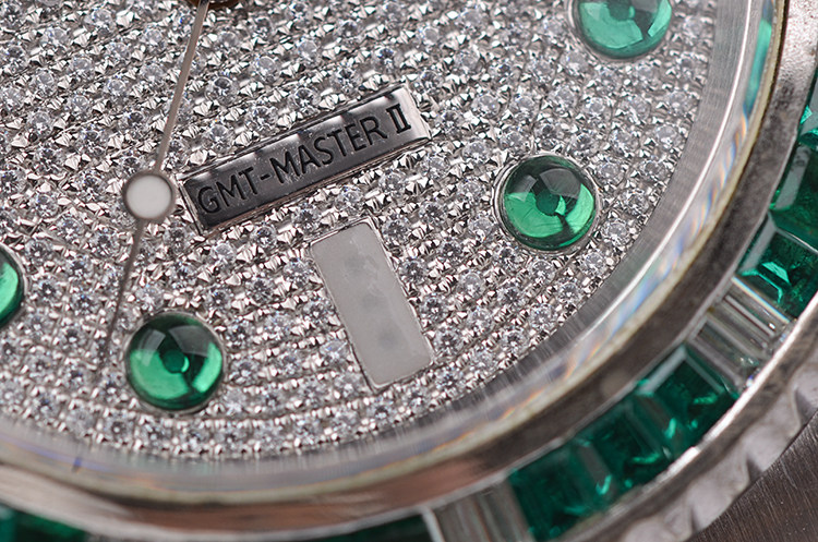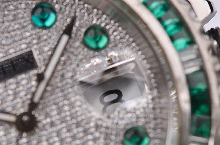 表壳:精钢904L精钢表壳, 表圈后镶绿宝石及钻石