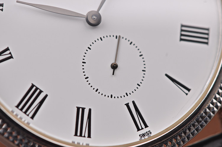 表盘:白色搪瓷表盘,黑色罗马数字刻度