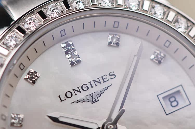 表盘:立体银白色珍珠贝母表盘,12颗钻石时标,共计0.048克拉