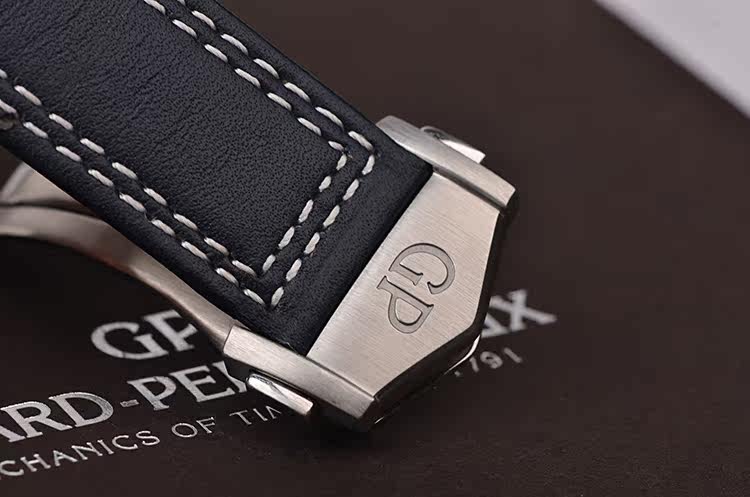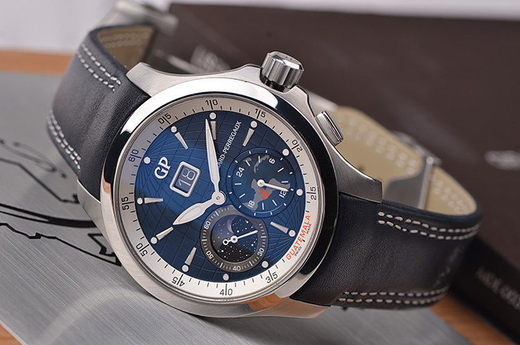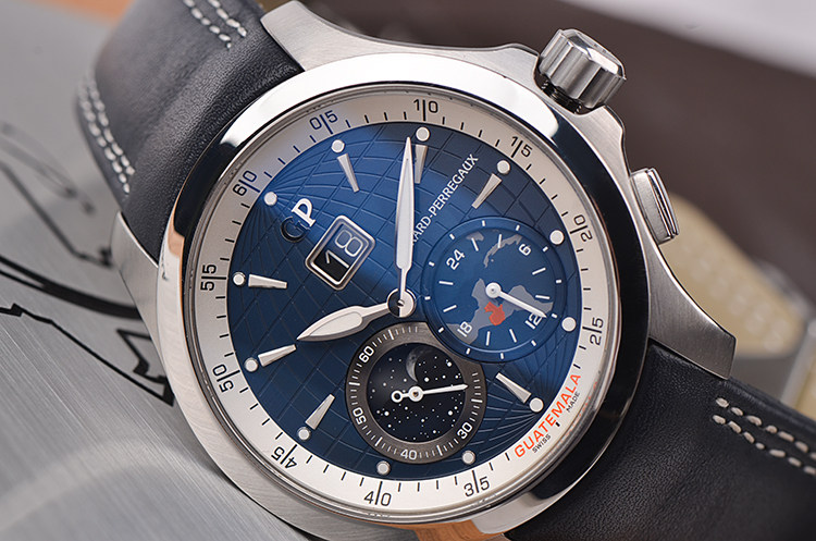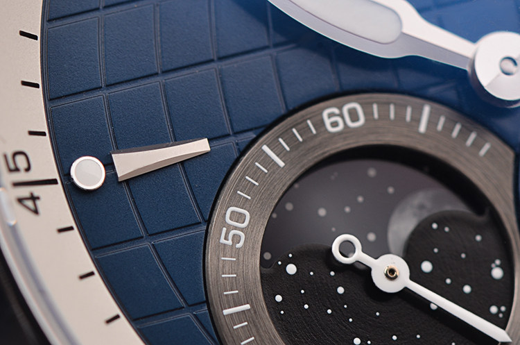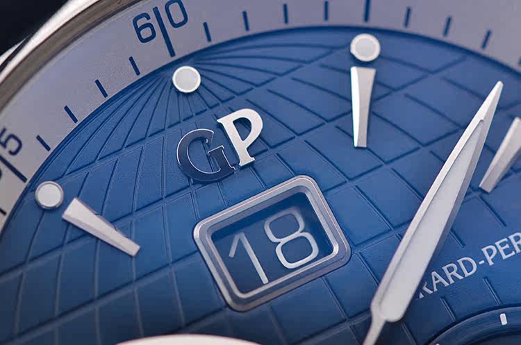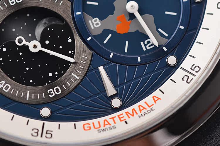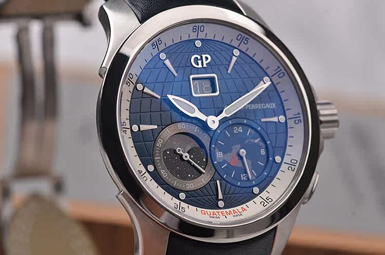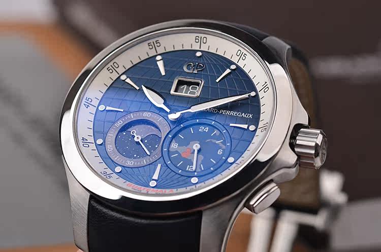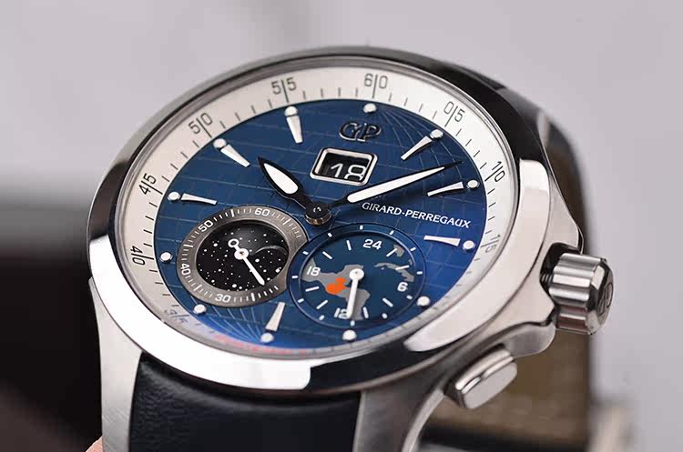 表盘:立体蓝色表盘,12点位大日历视窗,右下角第二时区显示,左下角月相及小秒针显示