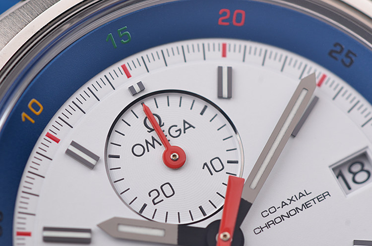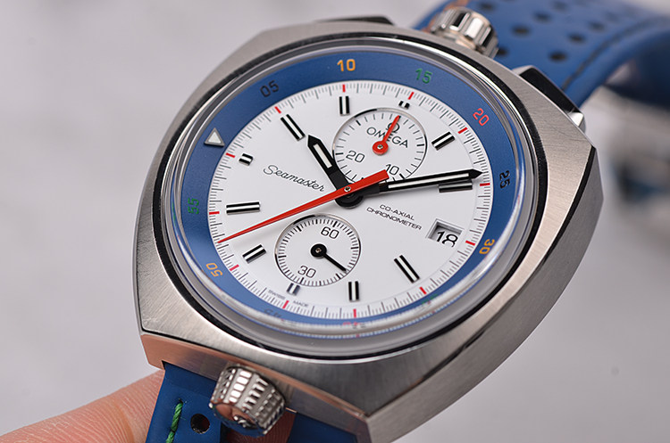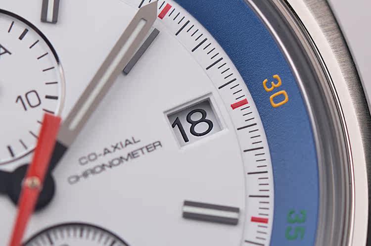 表盘:立体白色表盘,可旋转蓝色计时内表圈以五色刻度显示