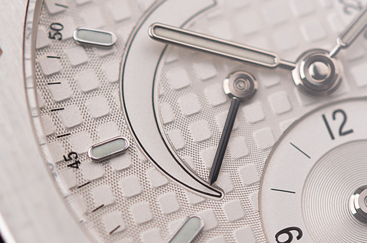 表盘:立体银白色华夫格表盘,动力储备显示,指针式日历,GMT两地时