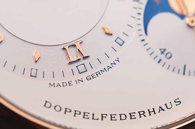 表盘:立体银白色偏心表盘,大日历,月相,动力储备显示