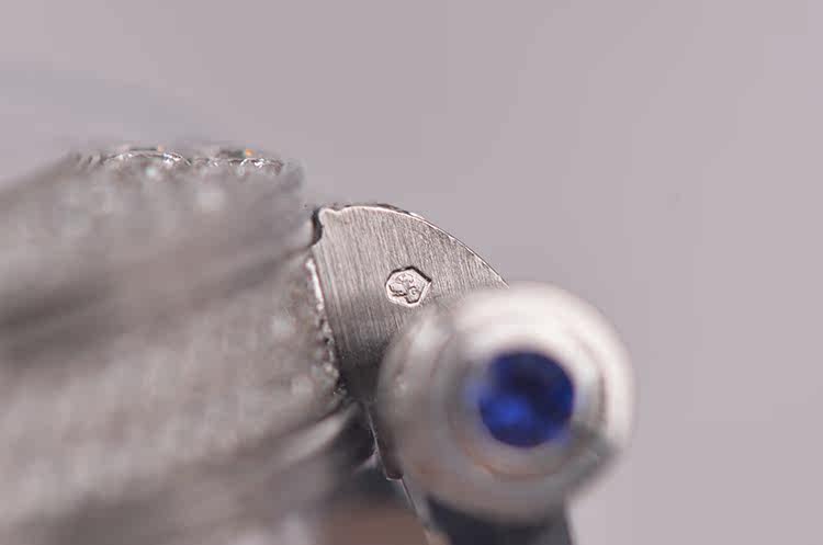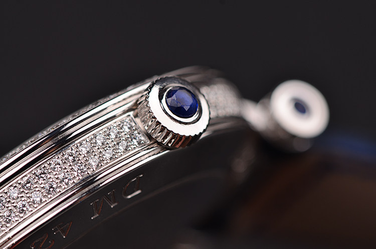 表壳:18K白金,表壳,表盘,表耳,表扣原厂镶嵌hao华天然美钻,4个表耳及表冠镶嵌5颗蓝宝石