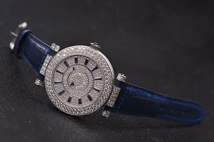 神秘时间白金镶钻满天星蓝宝石刻度自动机械皮带女表