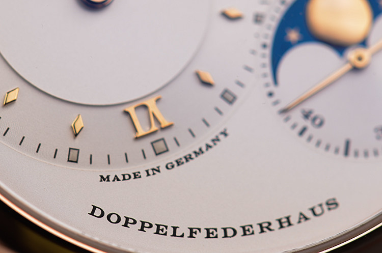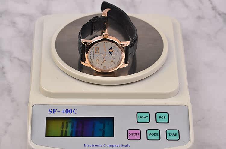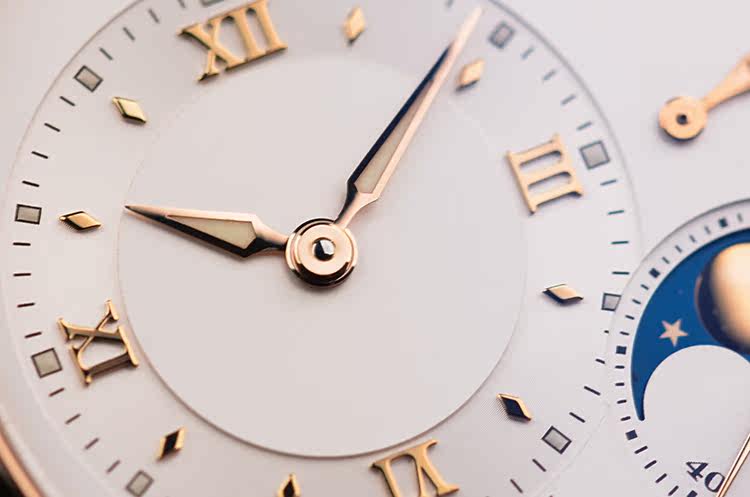 表盘:立体银白色偏心表盘,大日历,月相,动力储备显示