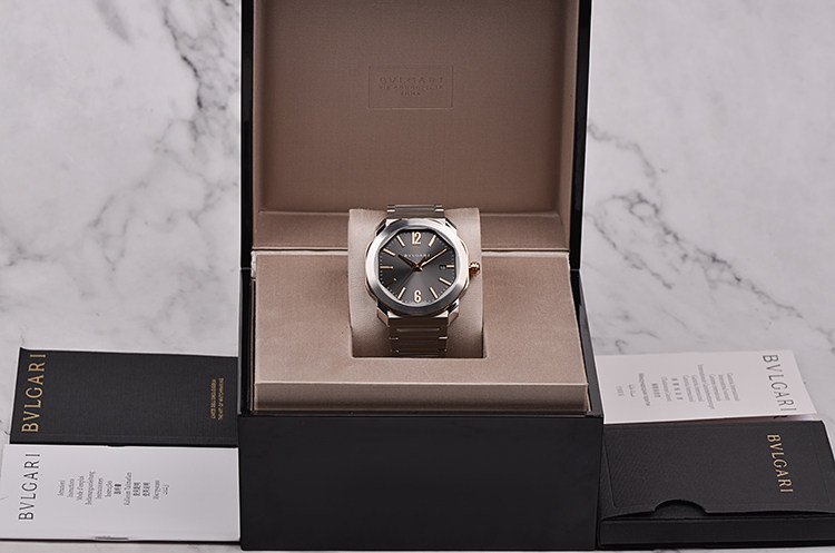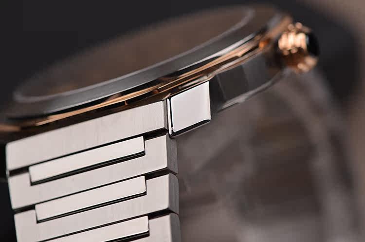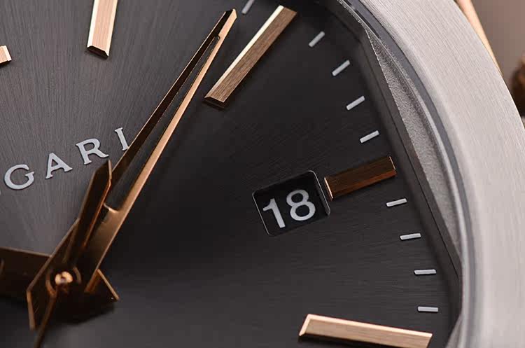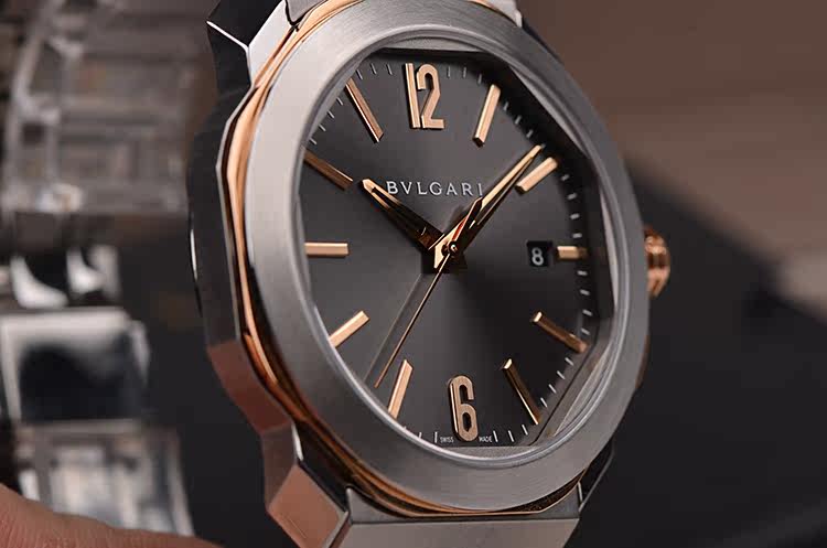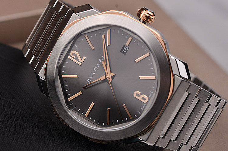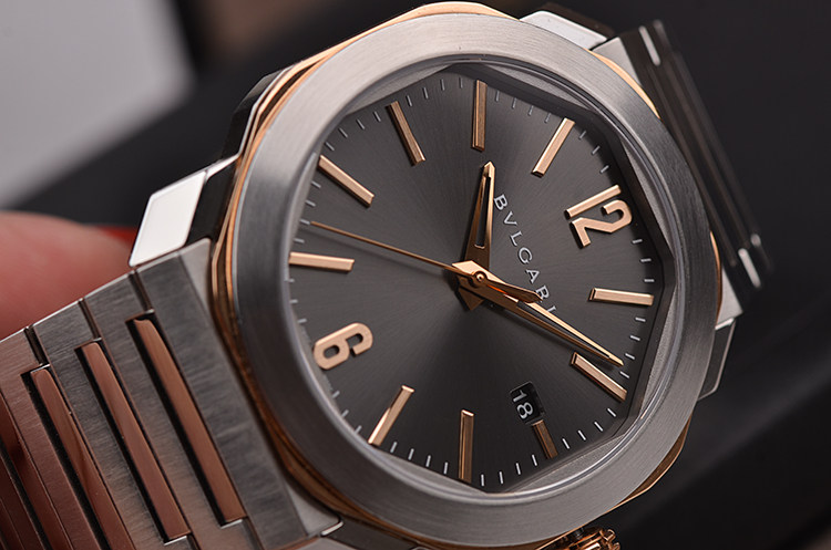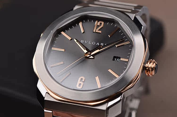 八角形玫瑰金及钢灰面大三针日历自动机械钢带男表