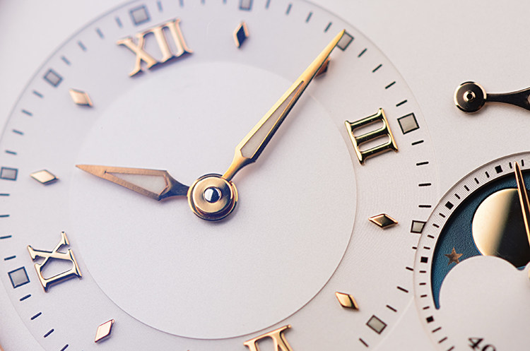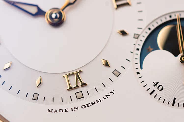 表盘:立体银白色偏心表盘,大日历,月相,动力储备显示
