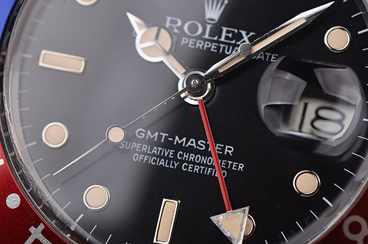 904L精鋼錶殼及鏈帶,折疊扣。拱形塑膠鏡面(波波膠),原廠原裝原配红蓝百事可樂圈成色極嘉,立體黑色盤,承接了1675的T25錶盤,夜光,指針已天然變黃,旋入式防水表冠。口徑39MM*13.5MM。防水100M。