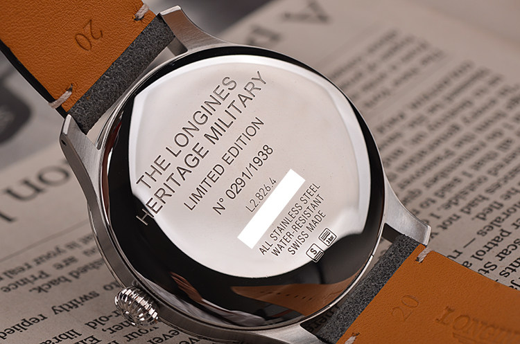 表壳:精钢表壳,“THE LONGINES HERITAGE MILITARY”军事复刻腕表标识底盖