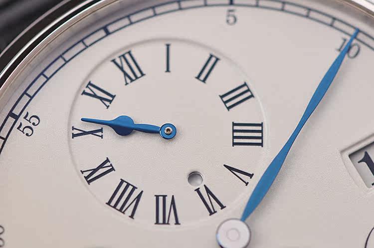 表盘:立体白色表盘,蓝钢桃心指针,规范针设计,大日历窗口