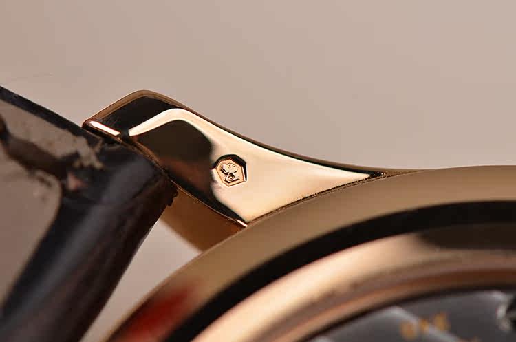 表盘:立体乳白色万年历月相表盘,玫瑰金阿拉伯数字刻度及指针