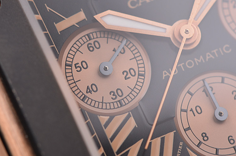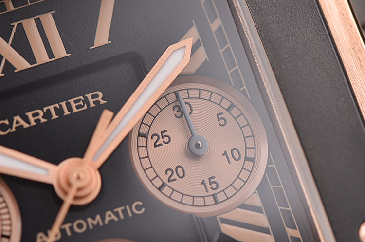 表盘:立体黑色计时表盘,罗马数字刻度,玫瑰金夜光时分针