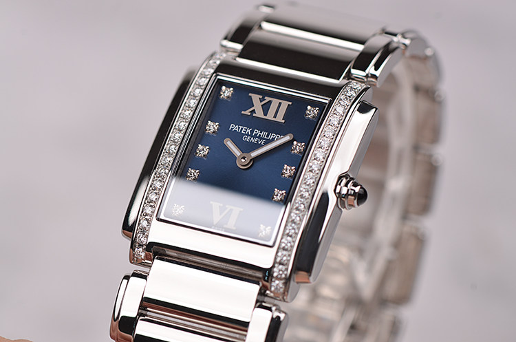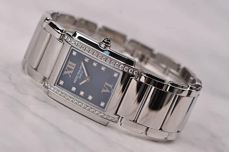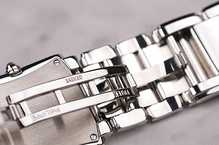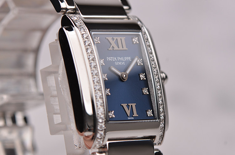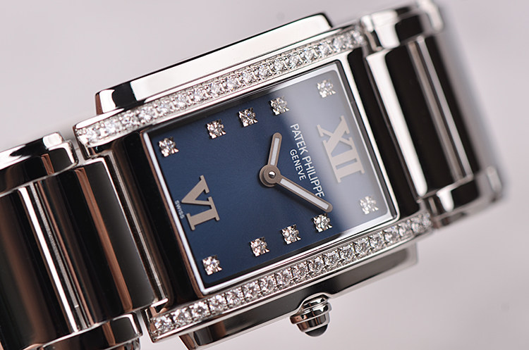 长方形精钢镶钻蓝盘石英钢带女表