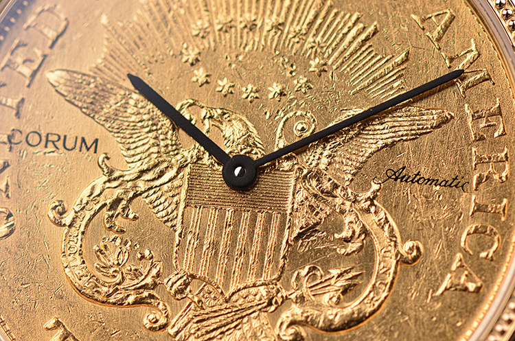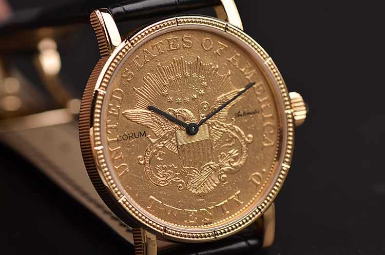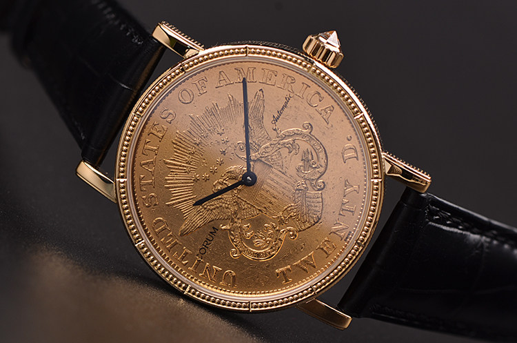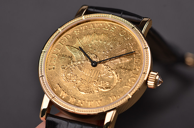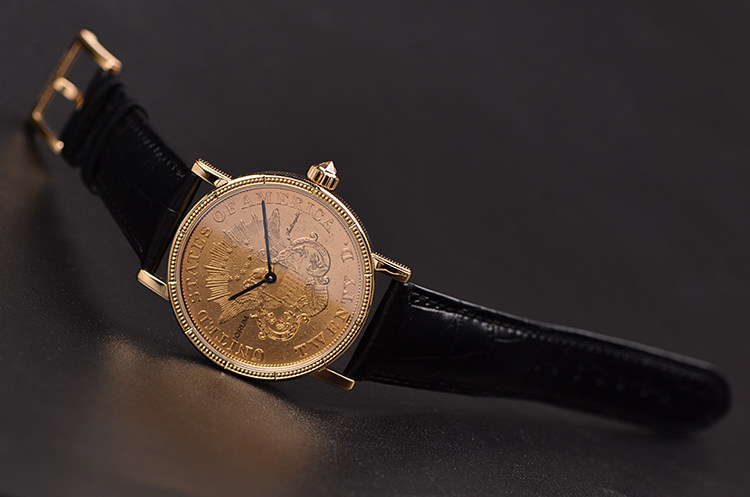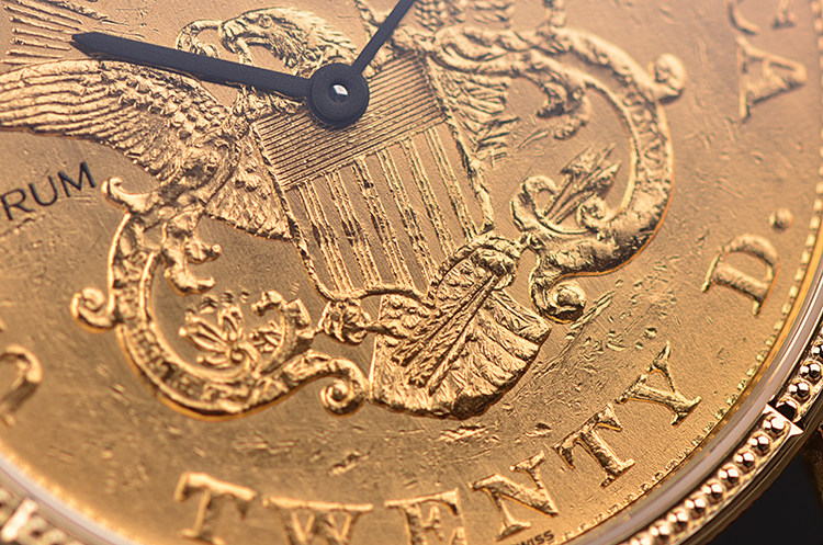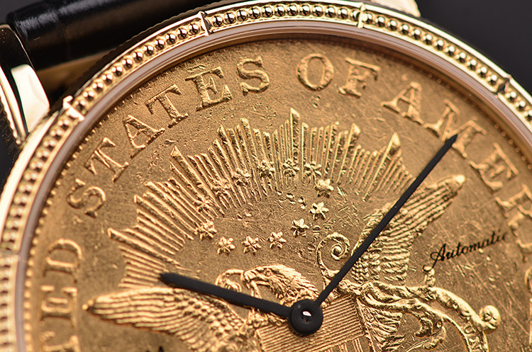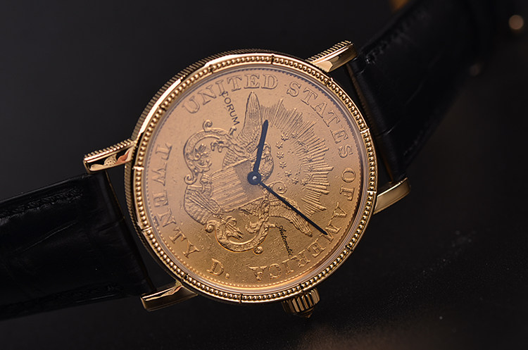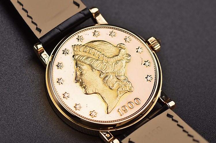 表壳:18K黄金,原版1900年美国20美元硬币为模型的表壳,表冠镶嵌一颗hao华大钻