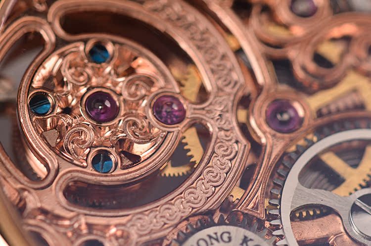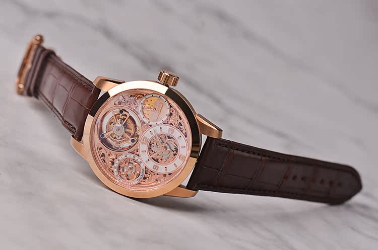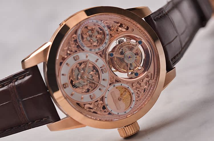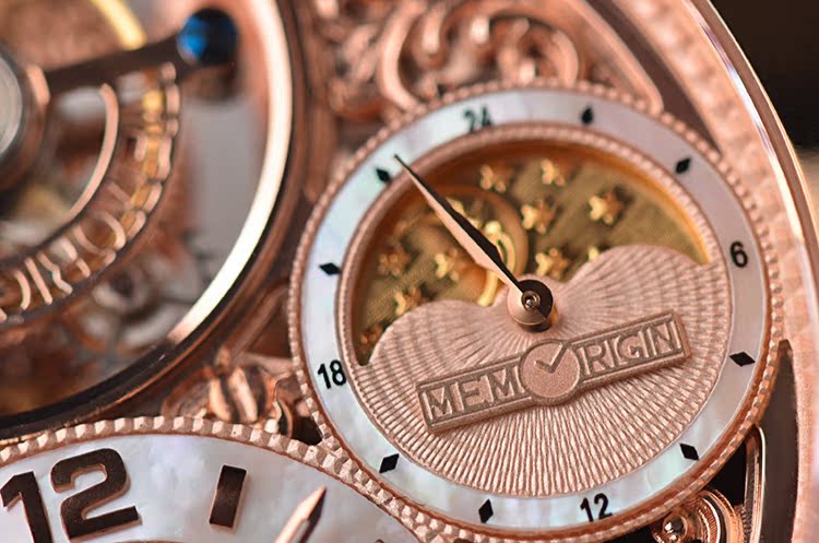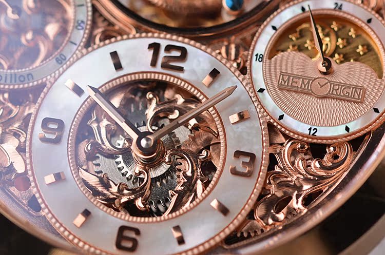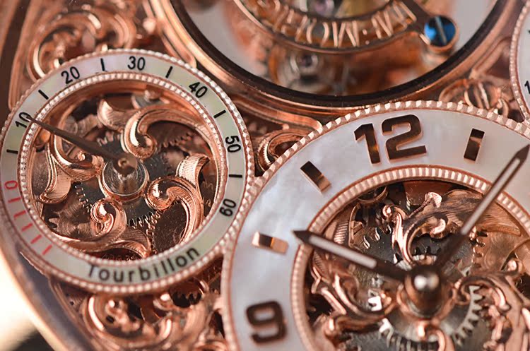 表盘:金色镂空雕花及珍珠贝母面盘,陀飞轮,昼夜显示,动力储备显示