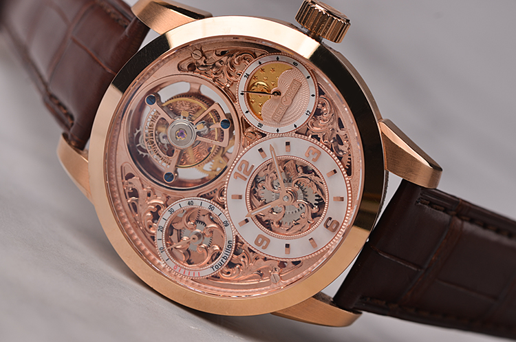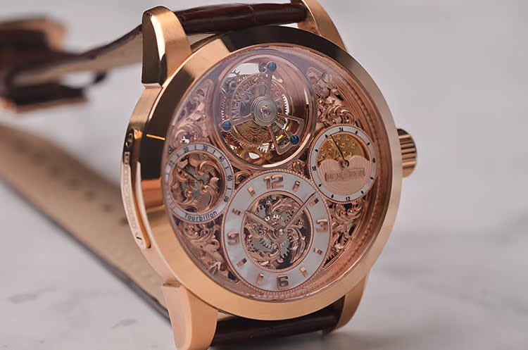 机芯:手动机械CAL.MO1231,万希泉自产雕花陀飞轮机芯,60小时动力储备