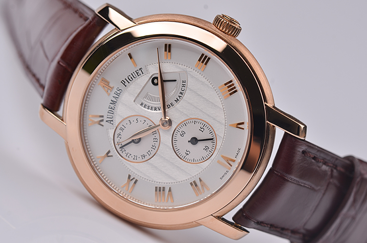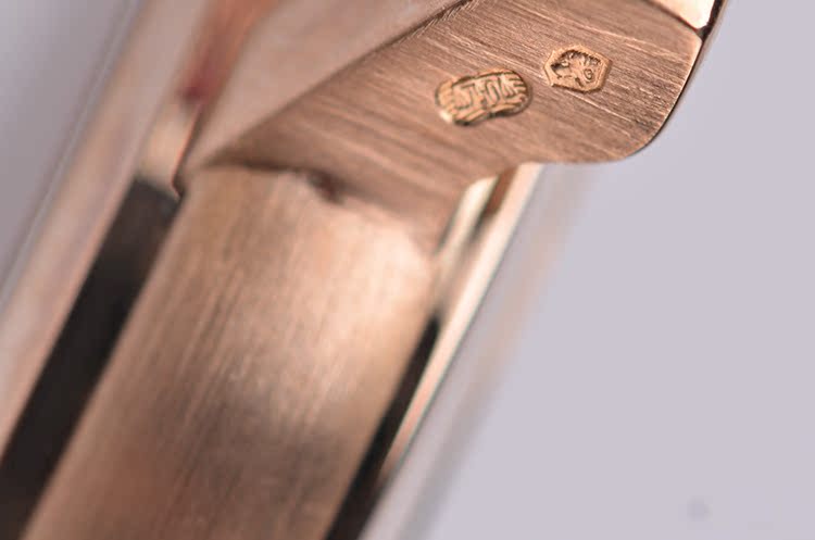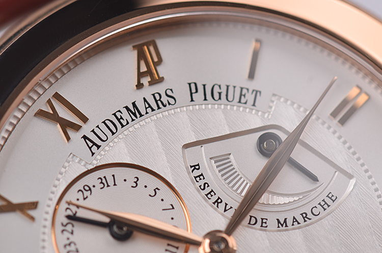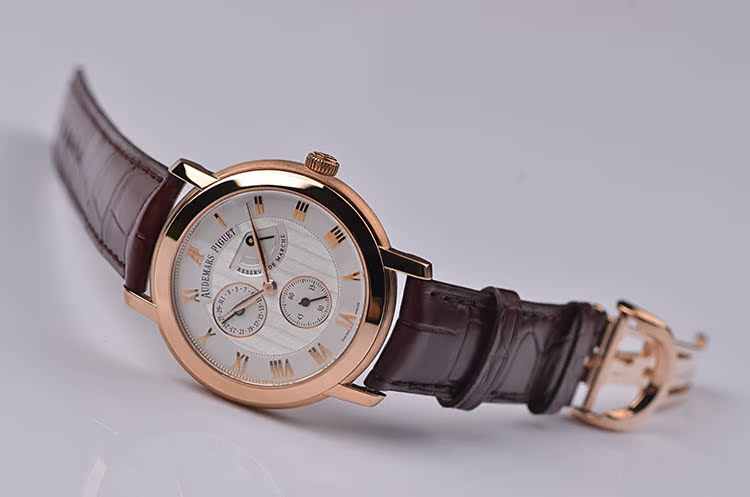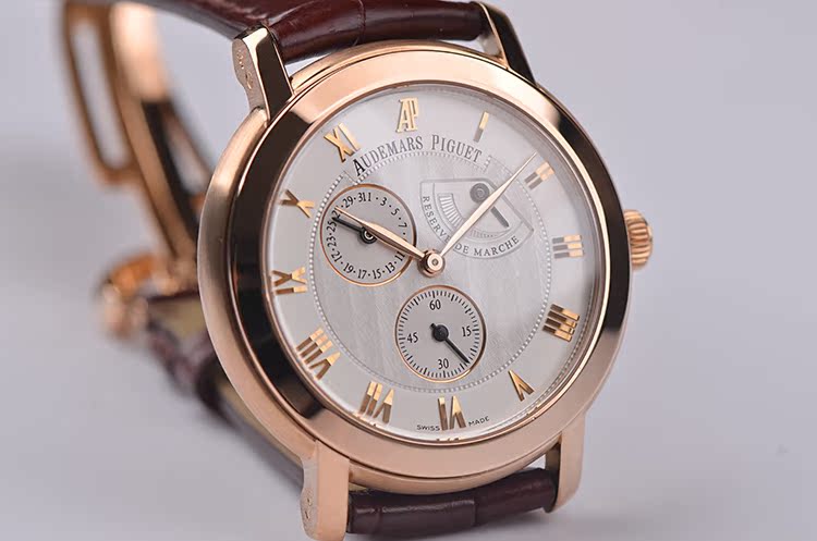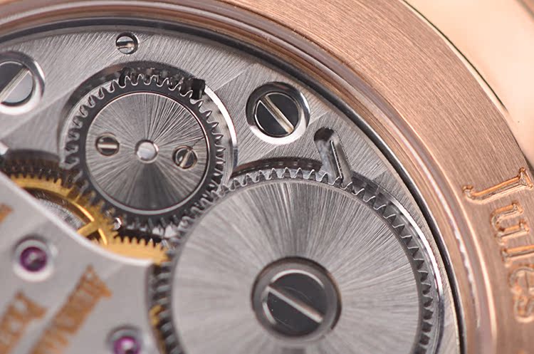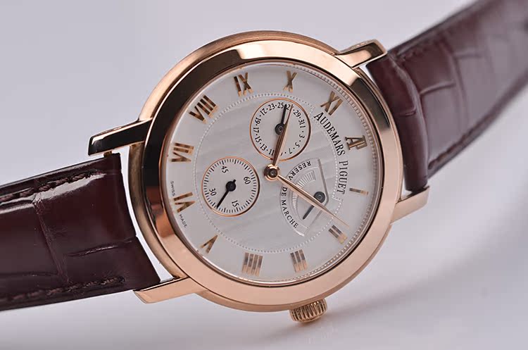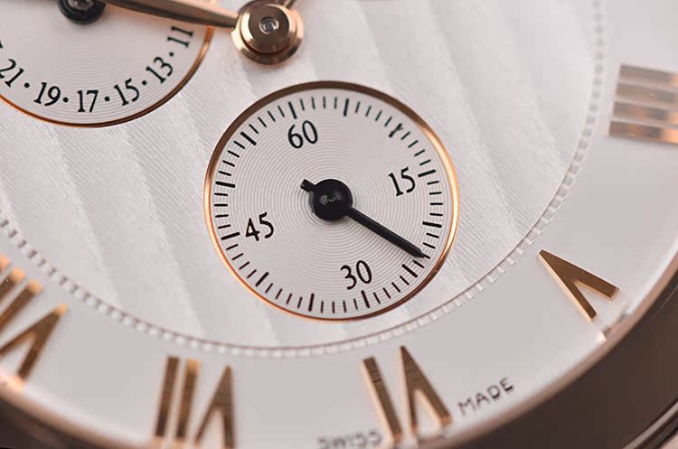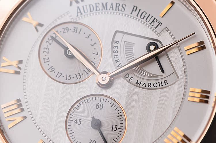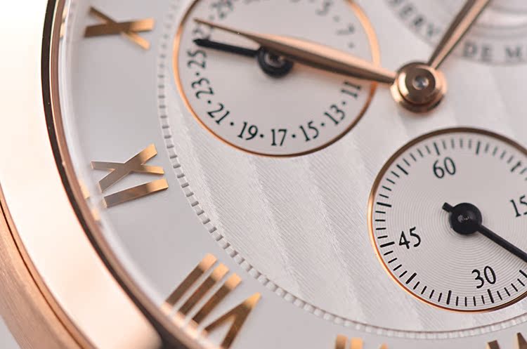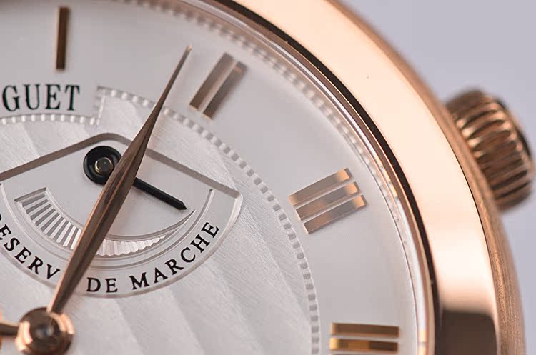 表盘:立体银白色日内瓦条纹表盘,玫瑰金罗马数字刻度及时分针,动力储备显示,指针式日历