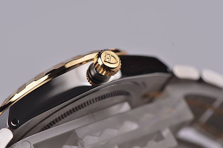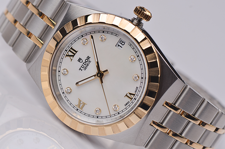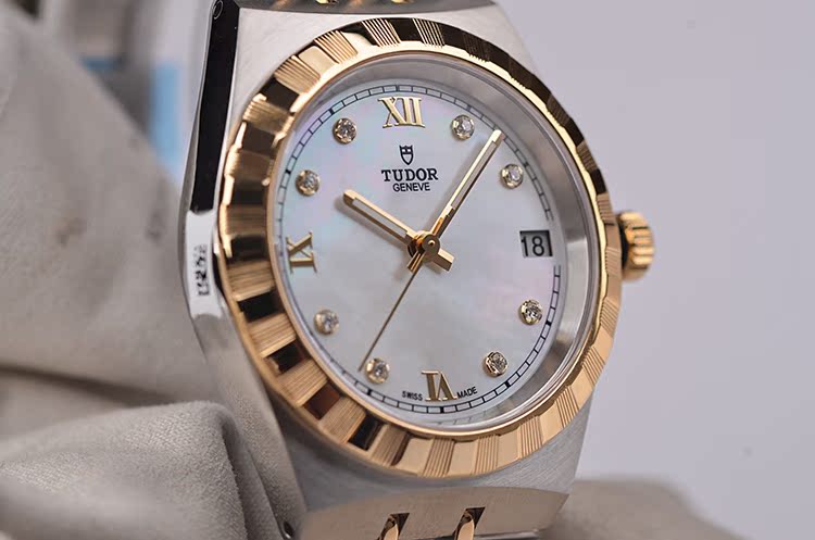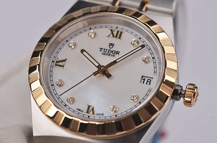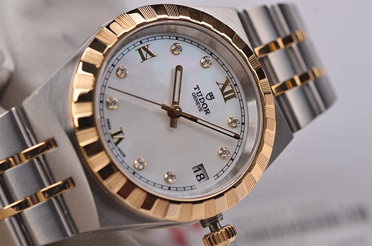 皇家系列黄金及钢贝母面刻度钻大三针日历自动机械女表