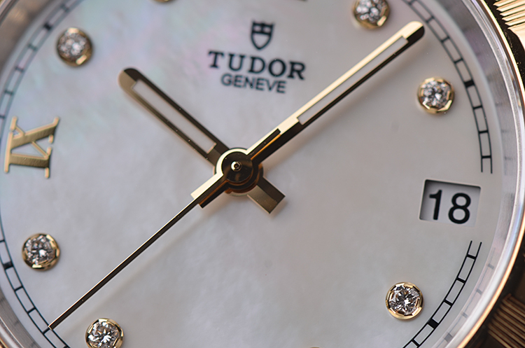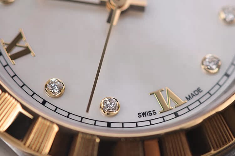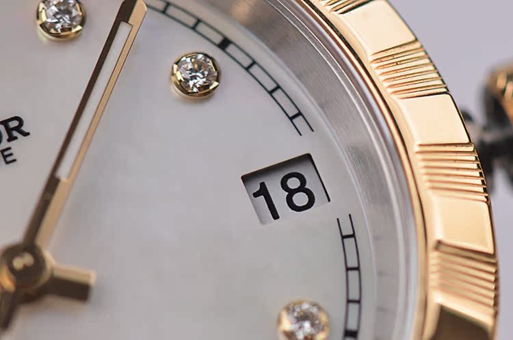 表盘:立体银白色珍珠贝母表盘,8颗钻石时标,黄金指针,日历显示
