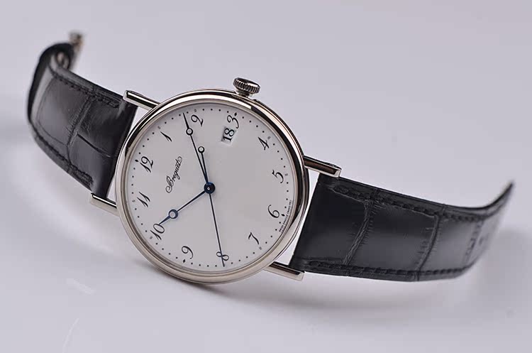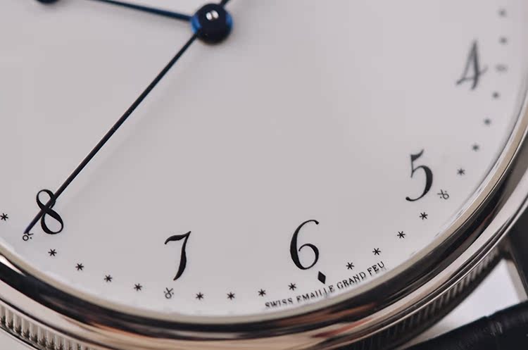 表盘:白色大明火珐琅面盘,阿拉伯数字刻度,蓝钢鱼眼指针
