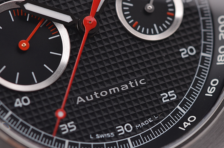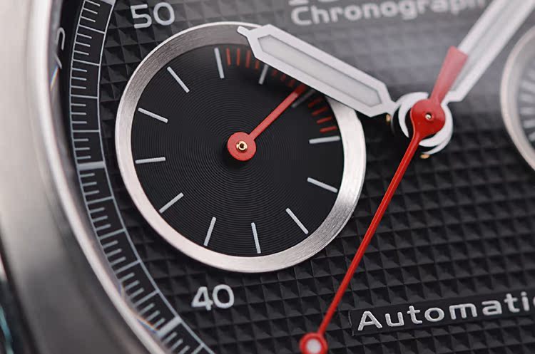 表盘:立体黑色方格纹计时表盘,测速计内圈