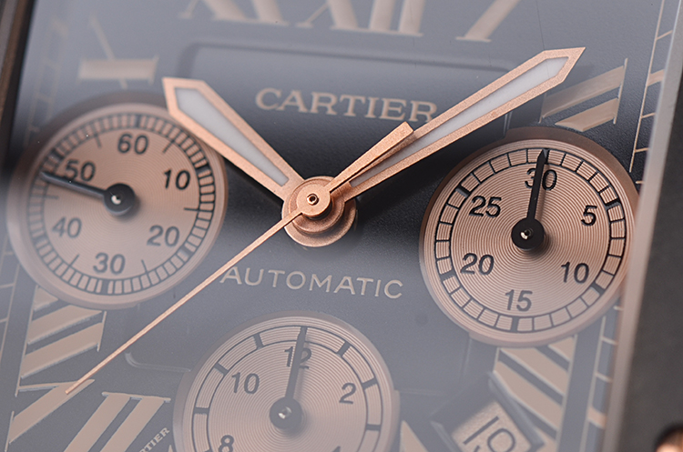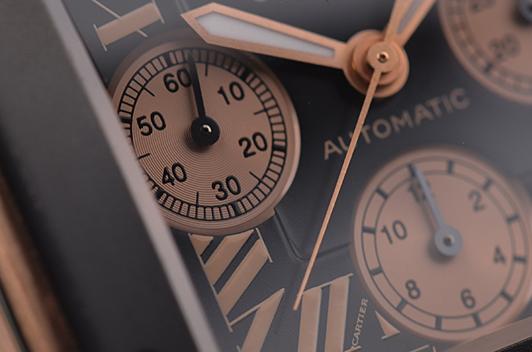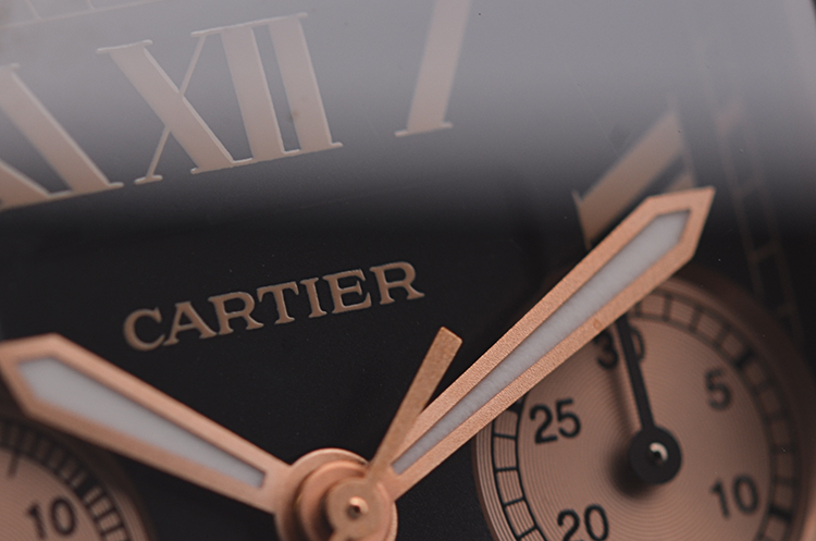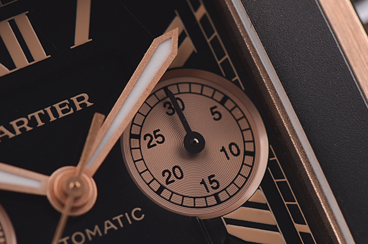 表盘:立体黑色计时表盘,罗马数字刻度,玫瑰金夜光时分针