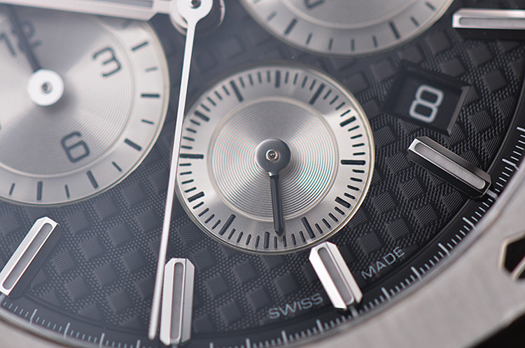 表盘:立体黑色及银色华夫格计时表盘,日历显示