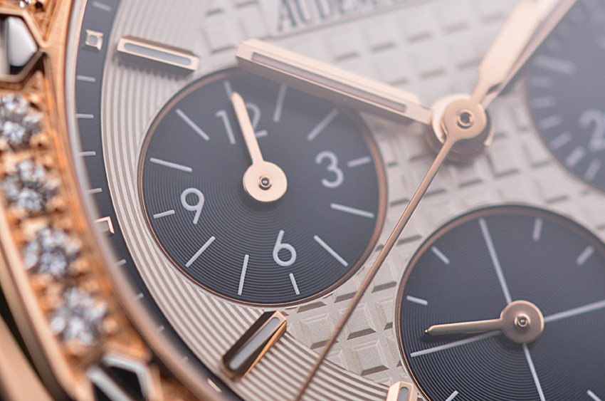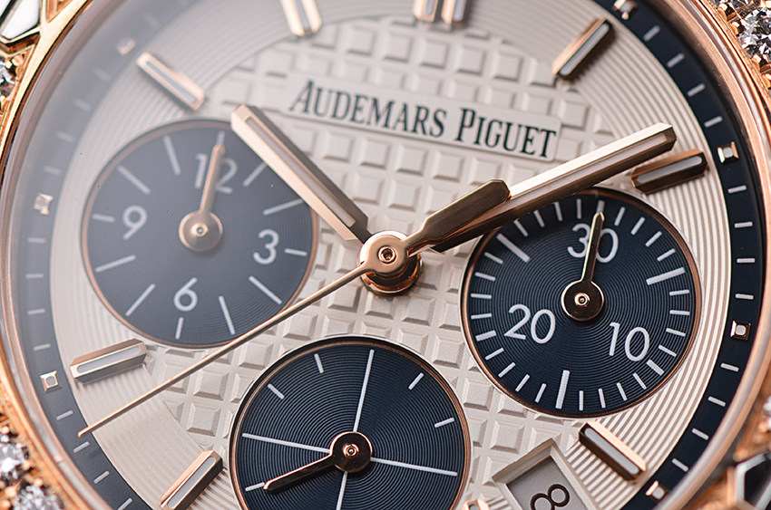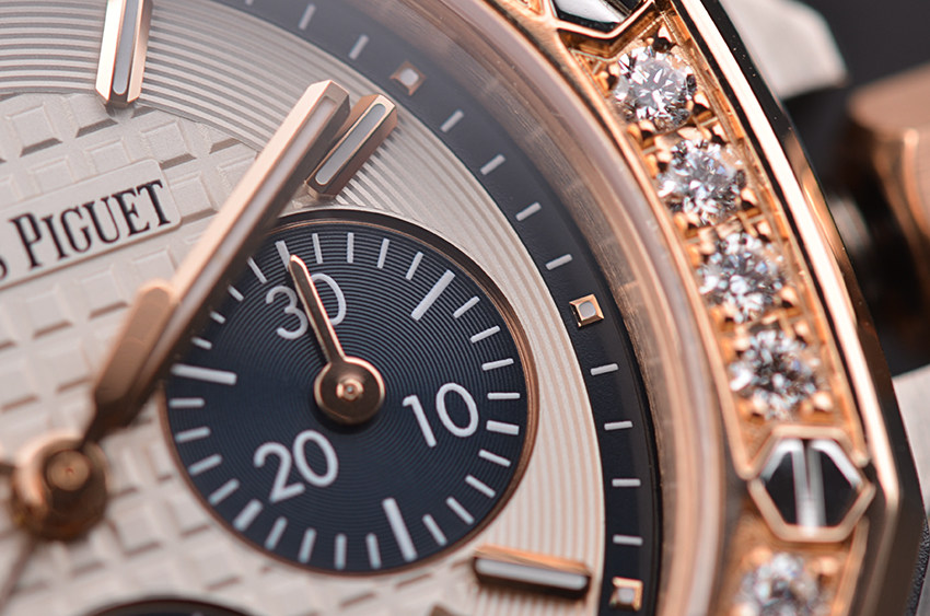 表盘:立体银白及蓝色双色华夫格计时表盘,玫瑰金刻度及指针,日历显示