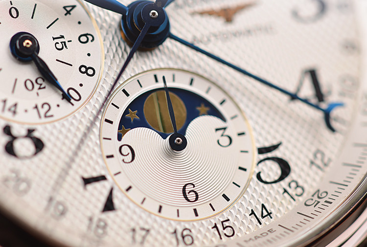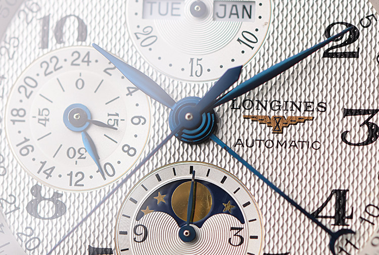 表盘:立体银白色全历月相计时表盘,月份,星期,日历,月相显示,阿拉伯数字刻度,蓝钢指针