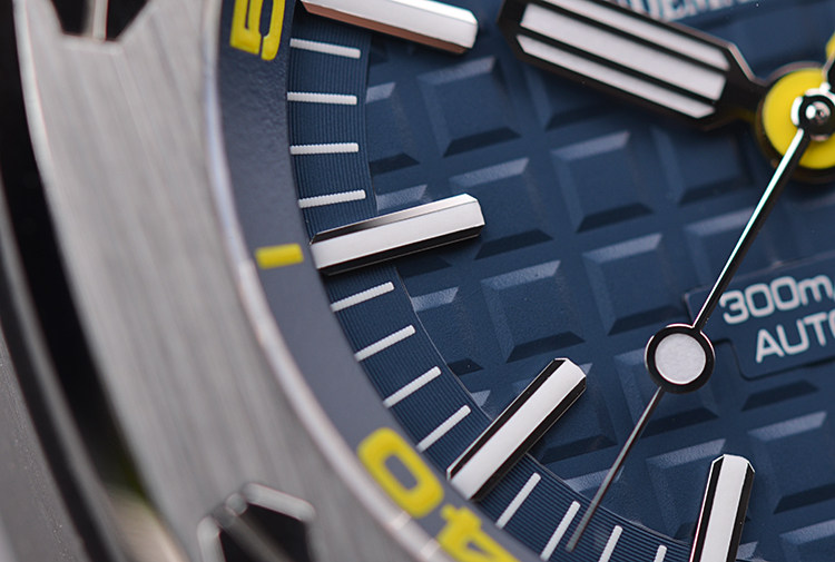 表盘:立体蓝色华夫格表盘,可旋转计时表内圈,夜光刻度及指针