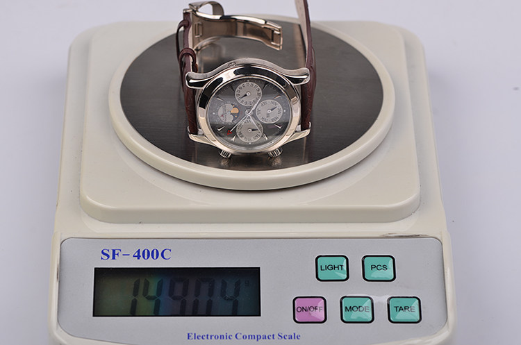 表盘:立体深灰色万年历月相表盘,月相显示,闹铃指针