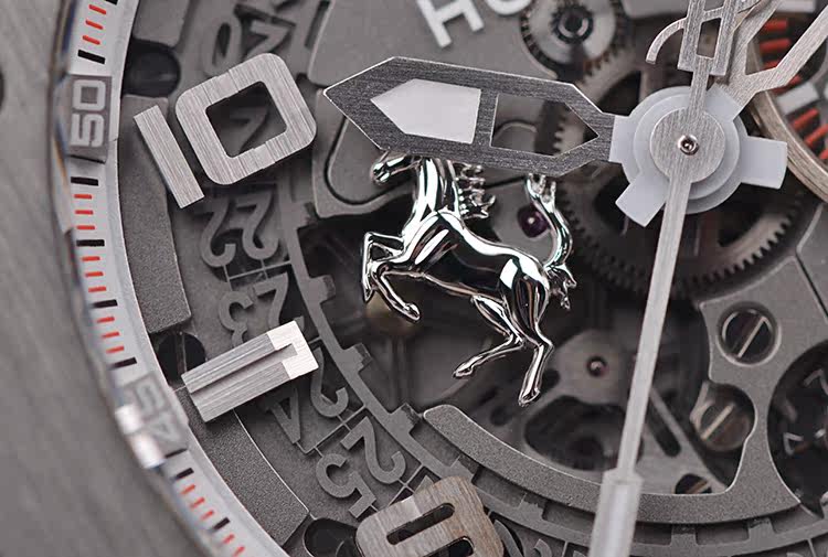 表盘:立体银灰色镂空计时表盘,日历显示,9点位法拉利跃马徽标