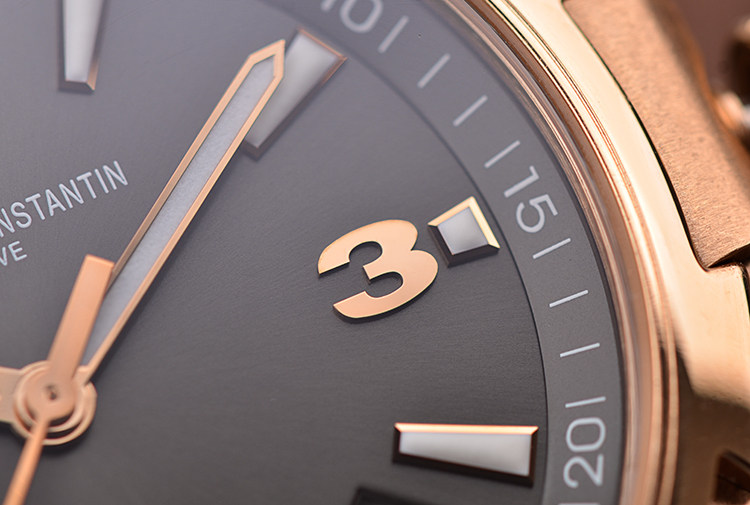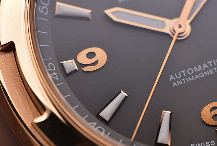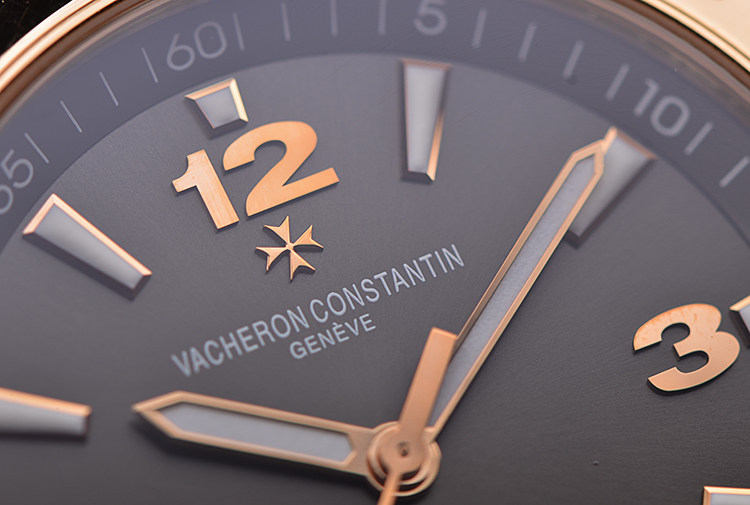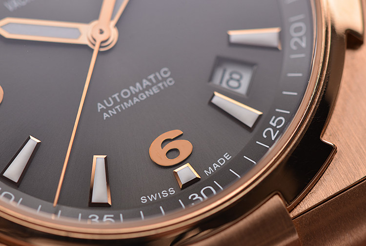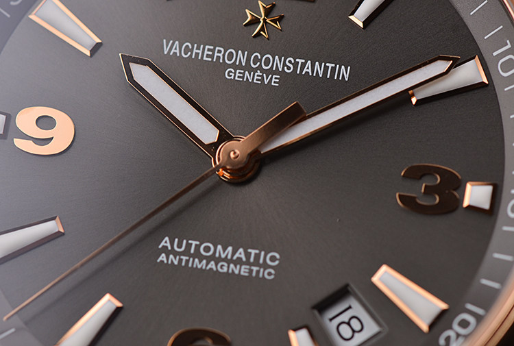 表盘:立体深灰色表盘,玫瑰金夜光刻度及时分针,日历显示