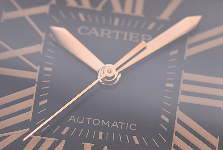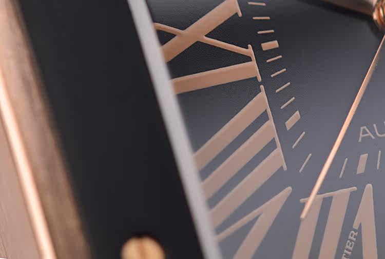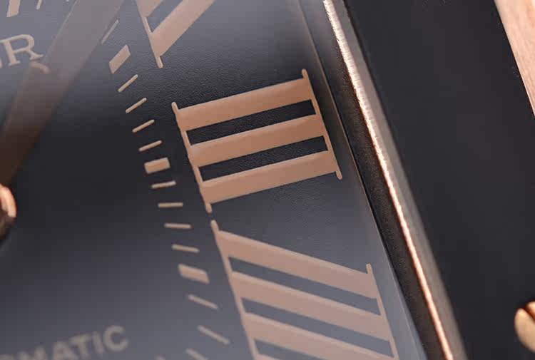 表盘:立体黑色表盘,咖啡色罗马数字刻度,玫瑰金指针
