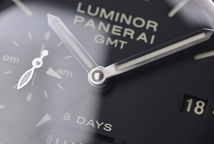 表盘:立体黑色三明治表盘,夜光刻度及指针,日历显示,GMT指针,昼夜显示,动力储备显示