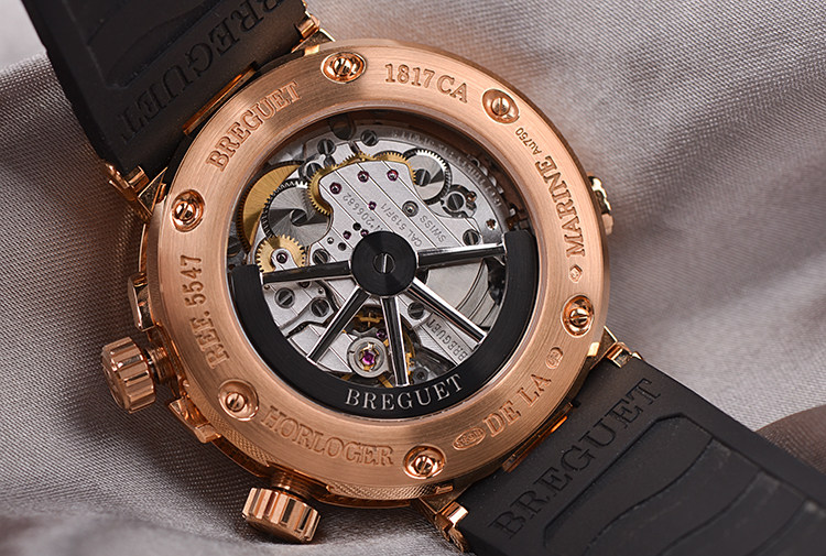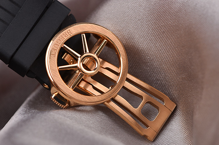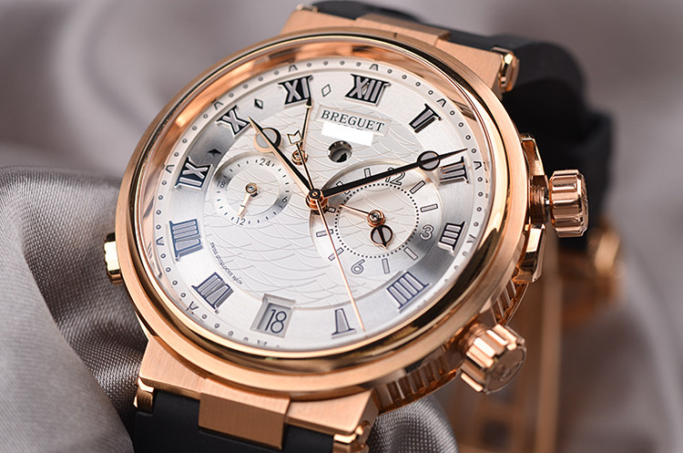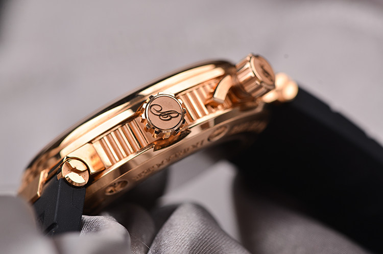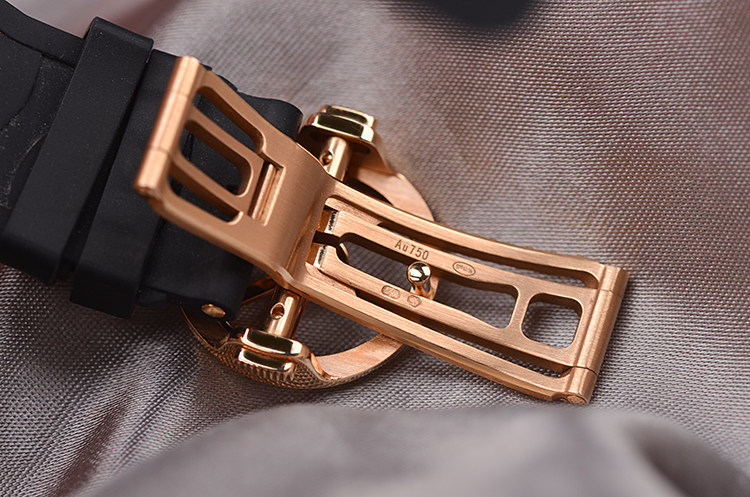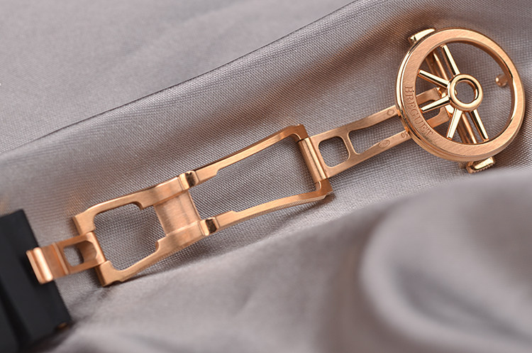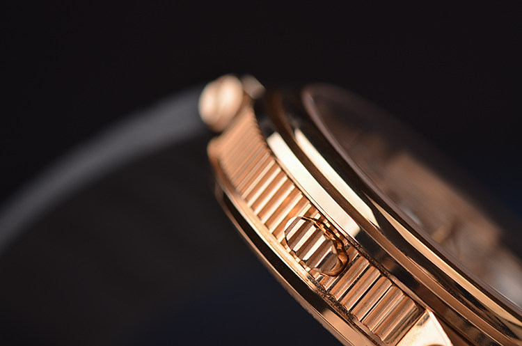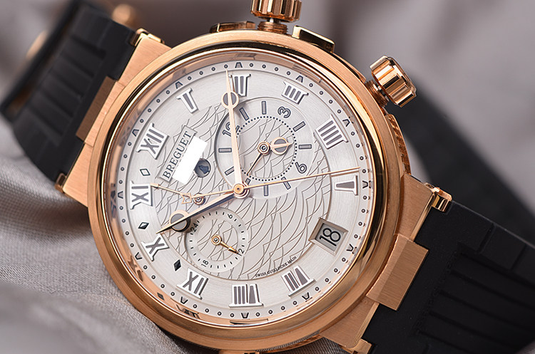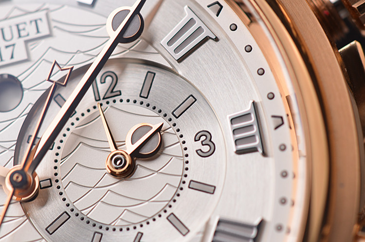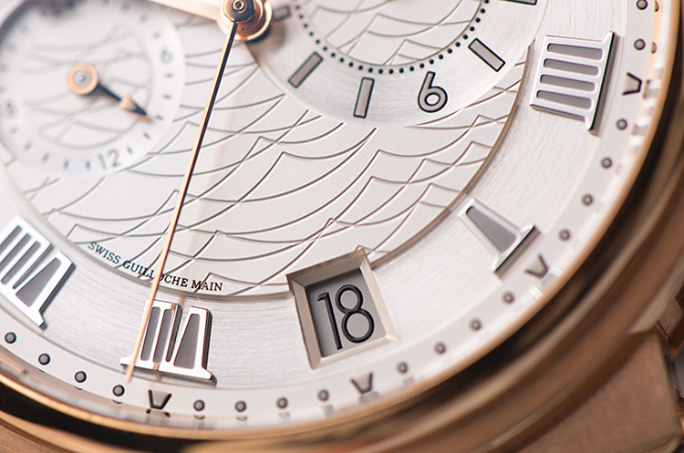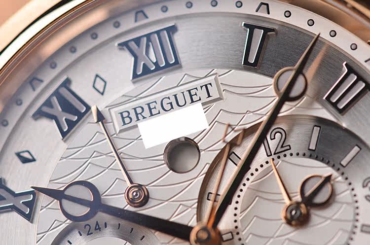表盘: 立体玑镂刻花镀银金质波浪纹表盘,白金罗马数字刻度,玫瑰金指针,闹铃开关显示,闹铃时间显示,第二时区显示,日历显示