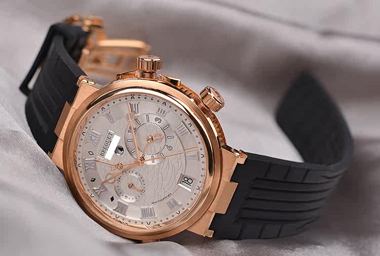 航海系列玫瑰金GMT两地时闹铃大日历自动机械折叠扣男表