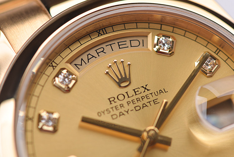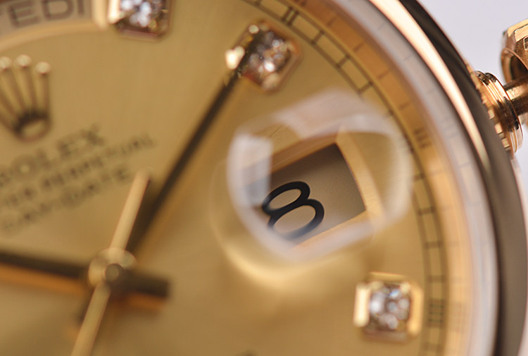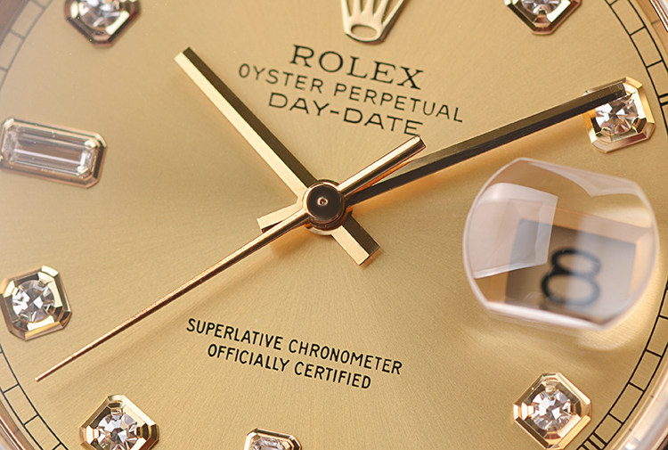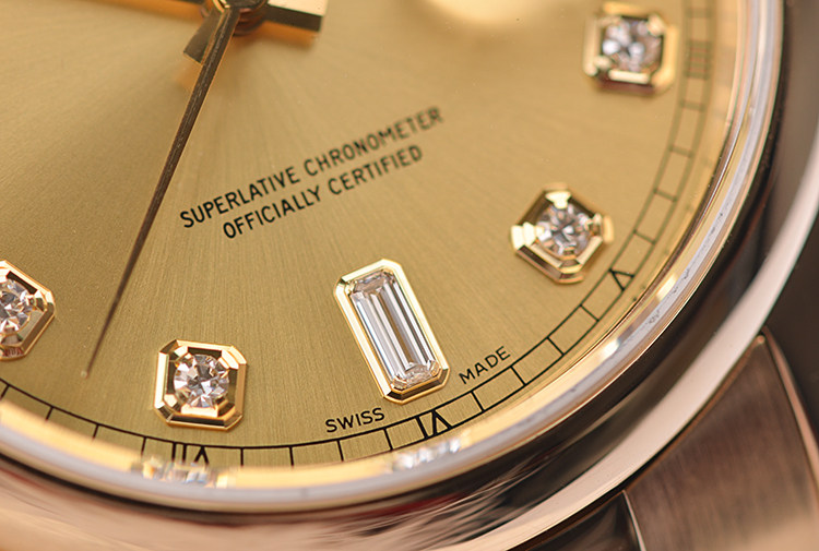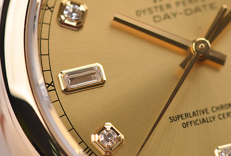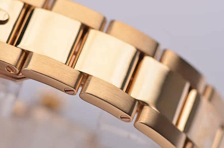 表盘:立体香槟金色面盘,钻石时标,6、9点位长条钻 罕有西班牙文星期显示