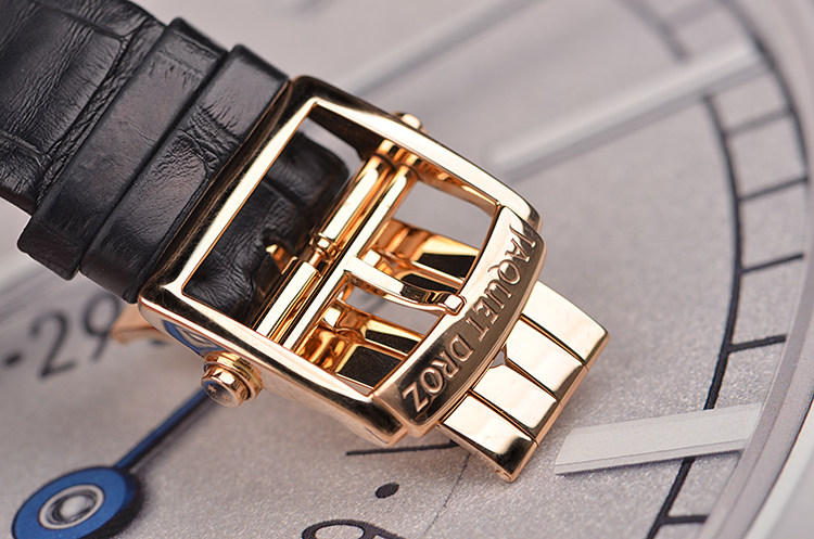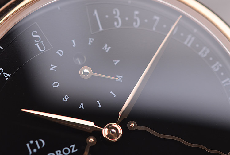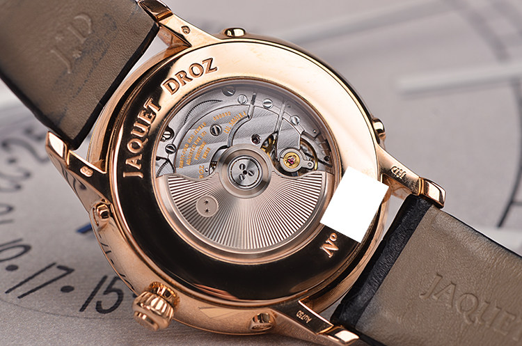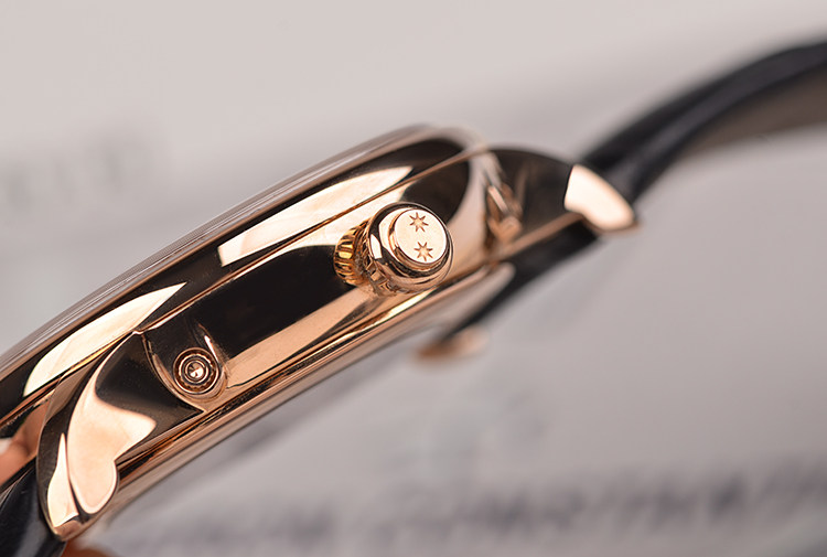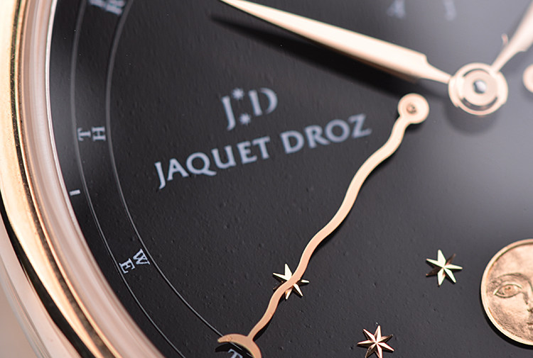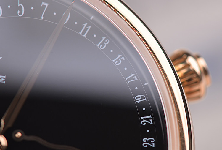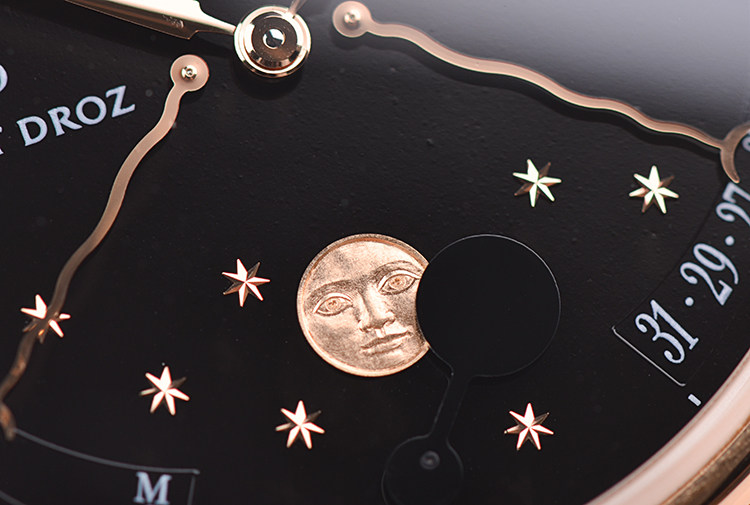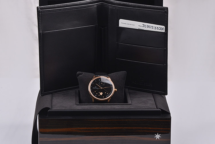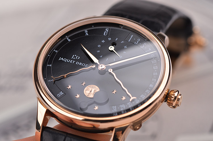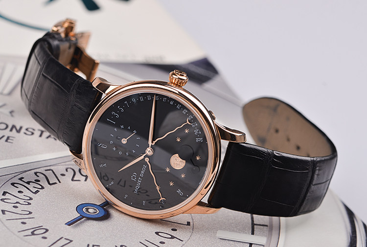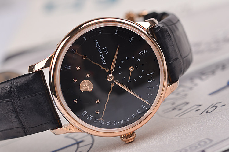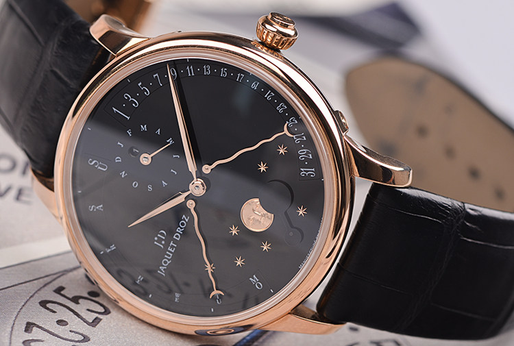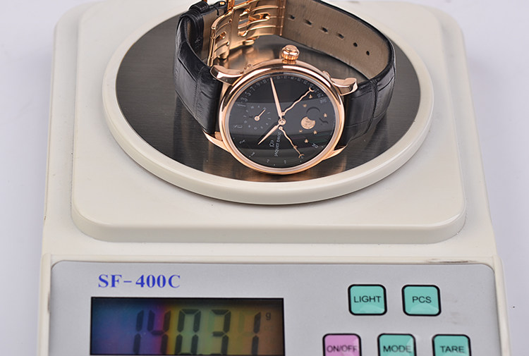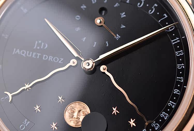 表盘:立体黑色大明火珐琅表盘,玫瑰金指针,万年历显示,人脸月相显示