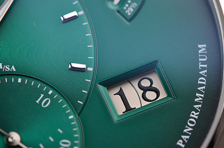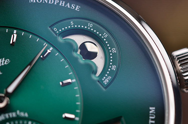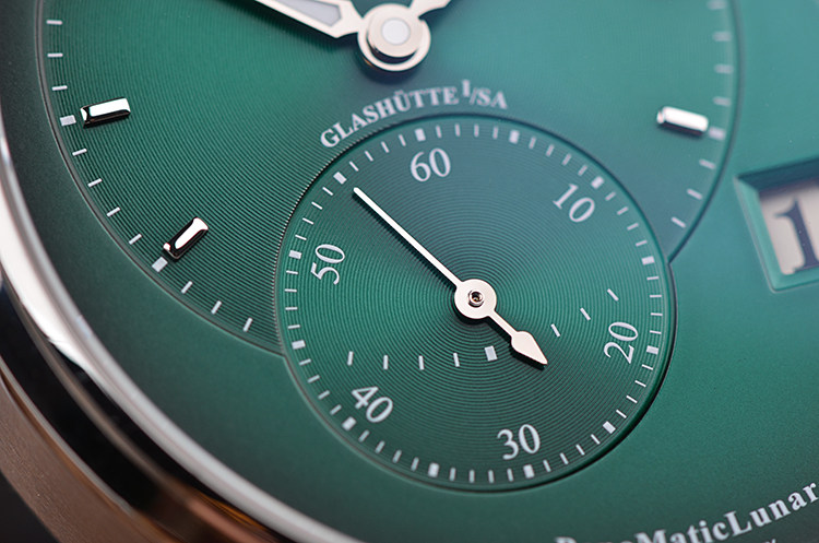 表盘:立体渐变绿色偏心表盘,大日历及月相显示