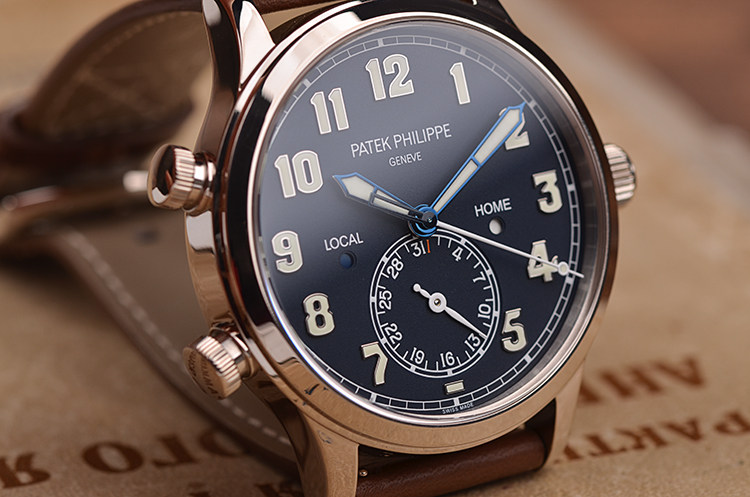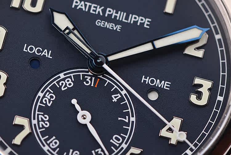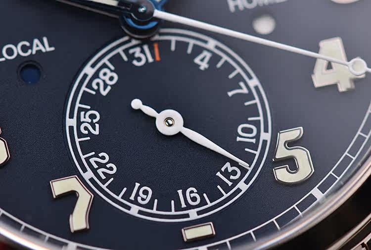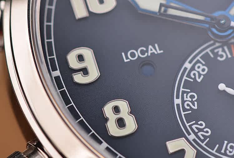 表盘:立体蓝色表盘,夜光阿拉伯数字刻度及时分针,两地时,指针日历,昼夜显示功能