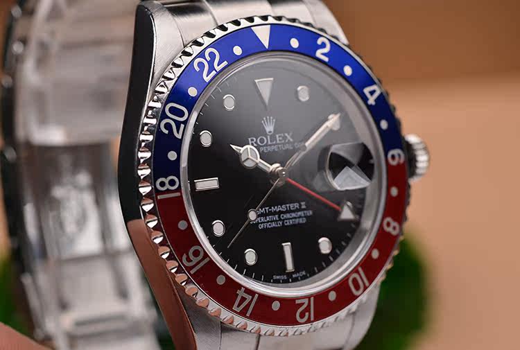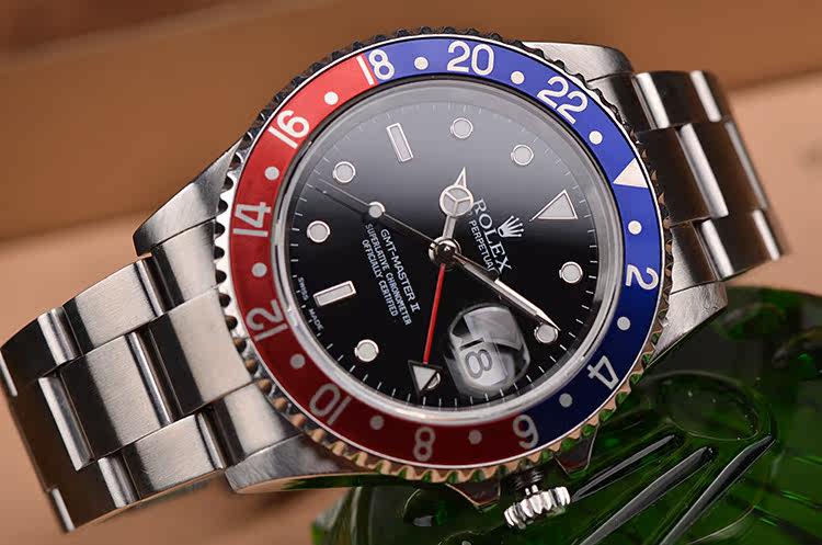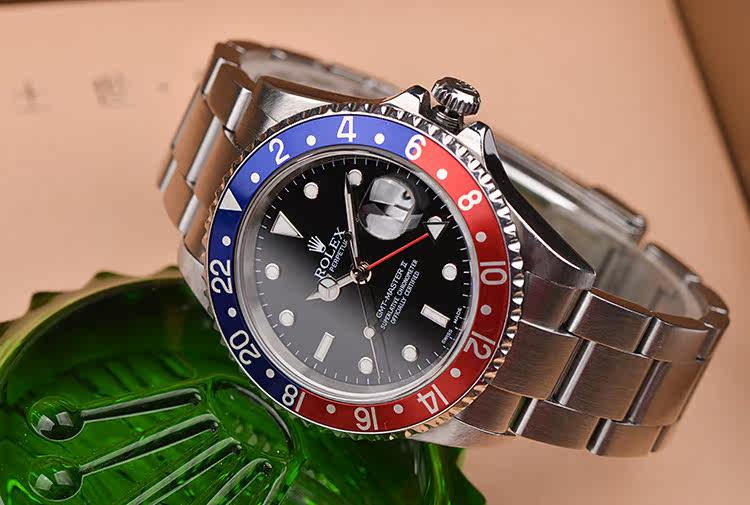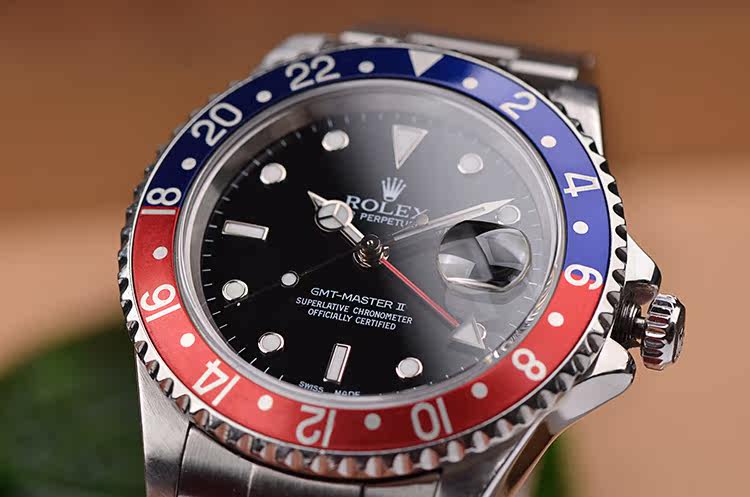 格林尼治型红蓝可乐圈GMT两地时日历钢带腕表