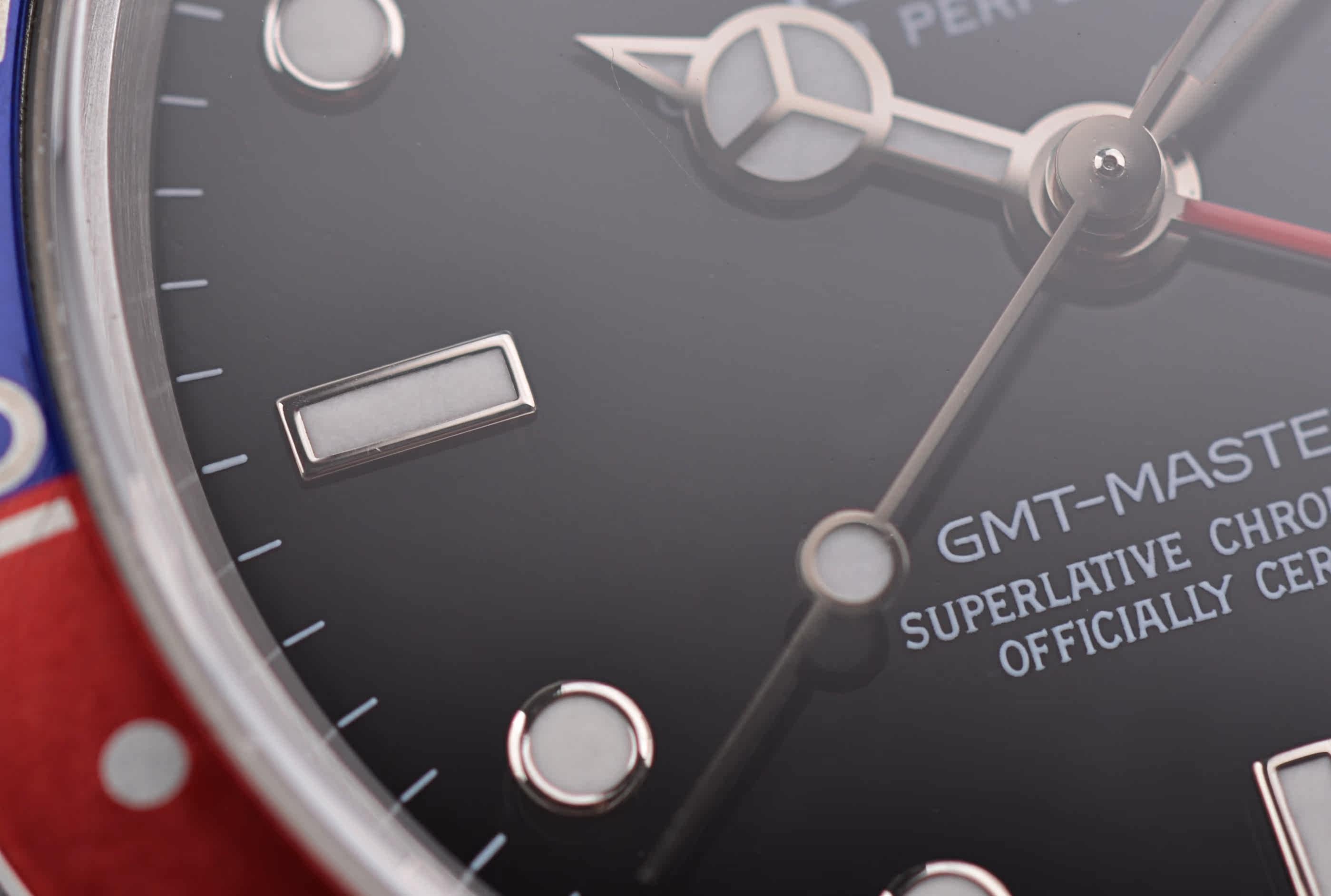 904L精钢表壳及链带,可微调折叠式表扣。原厂原装红蓝可乐圈状态靓。蓝宝石水晶镜面,立体黑色面盘,夜光刻度及指针,GMT第二时区功能,3点位放大镜日历视窗。旋入式防水表冠。口径40MM*13MM。防水100M。