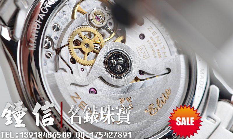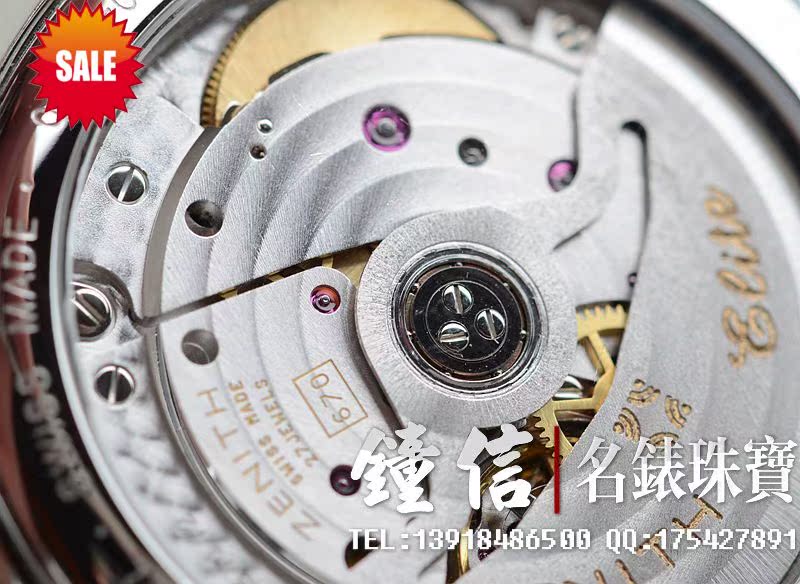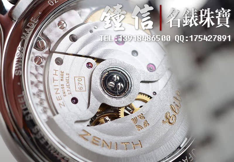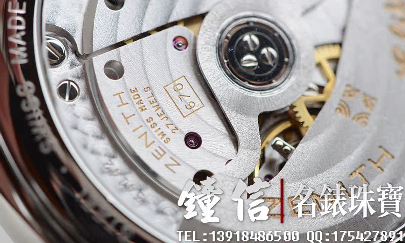 真力时自产的CAL.670机芯,由144个零件组成,27钻,KIF避震器,日内瓦纹及鱼鳞纹精致打磨。摆频28800。走时精准。