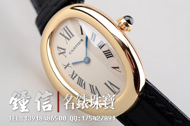 18K黄金表壳及表扣,女皇头印记。弧形蓝宝石水晶镜面。立体喷砂面盘,漆字罗马刻度,蓝钢指针。把头镶有一枚蓝宝石。口径:30MM*22MM*6MM。后配全新鳄鱼皮表带。防水30M。