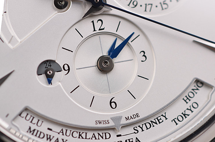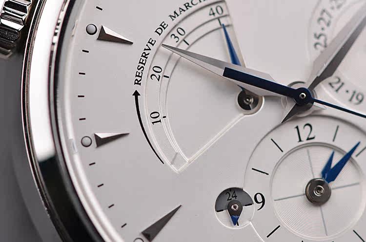 表盘:立体银白色世界时表盘,指针式动能储备显示,指针日历