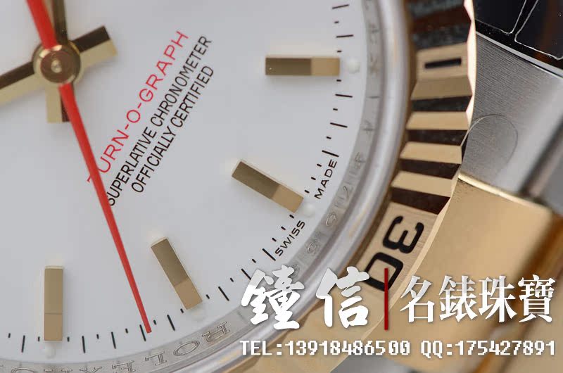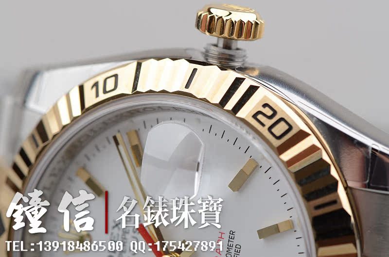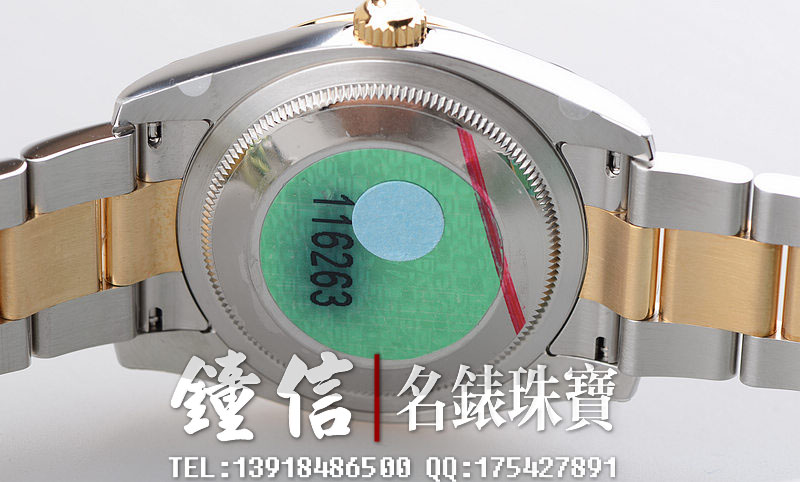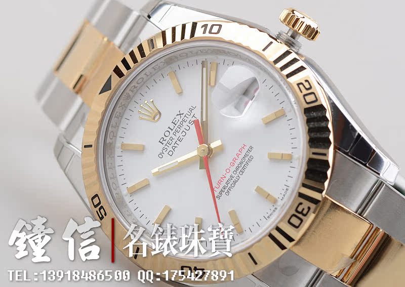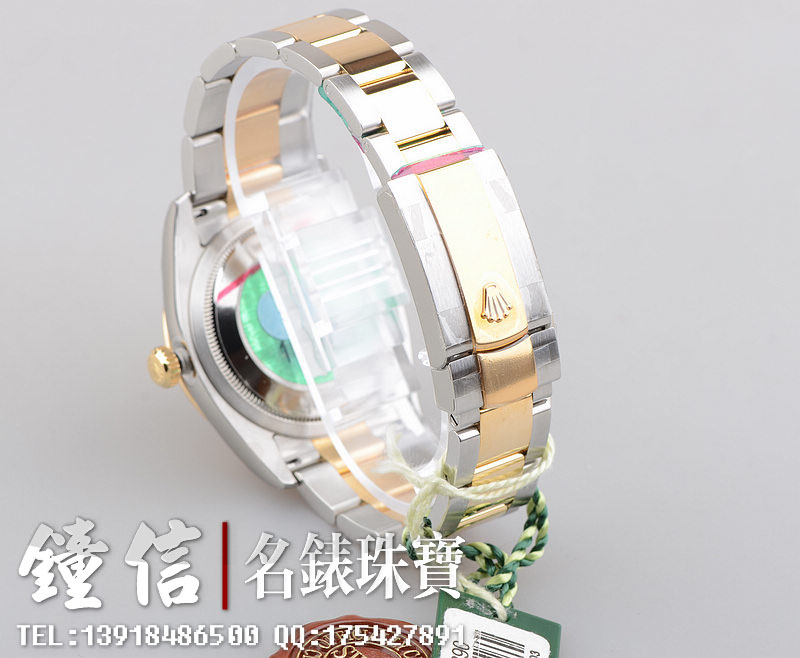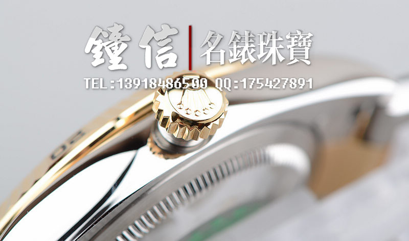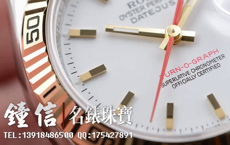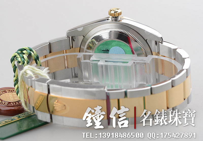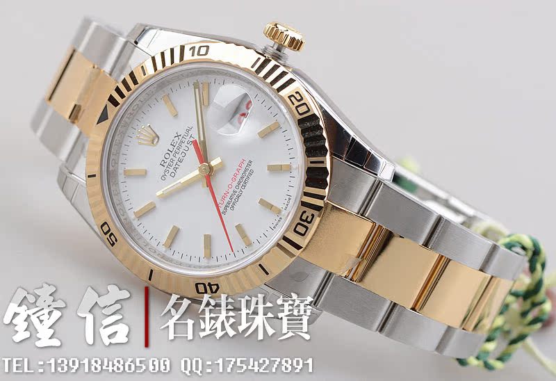 904L精钢与18K黄金相间表壳及链带,专利折叠式表扣。蓝宝石水晶镜面。金质夜光刻度及指针,红色秒针,白色面盘。口径36MM*10MM。防水100M。