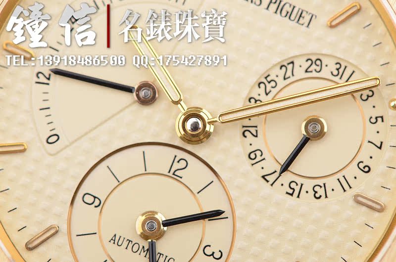 AP自产的自动机械机芯,9点至11点位动力储存显示,6点位第二时区